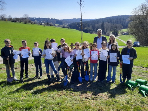 Es ist schon zur beliebten Tradition geworden, daß die Abschlußklasse 4 der Naturparkschule Kaisersbach vor dem Besuch von weiterführenden Schulen „ihren“ Baum in der Grundschul-Allee bei den Kräuterterrassen pflanzt. Dieses Jahr hat man sich einen Speierling ausgesucht, der bei strahlendem Sonnenschein mit Hilfe des Bauhofes eingepflanzt werden konnte.